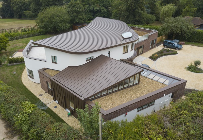 VM Zinc in Pigmento Brown was used to create this striking airplane wing design on a residential property. The project was delivered alongside Kingsley Roofing London.